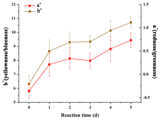 Chromaticity a* and b* values of gelatin/zein/glucose nanofiber films after Maillard reactions conducted at 60 °C and 50% RH for 0~5 days.