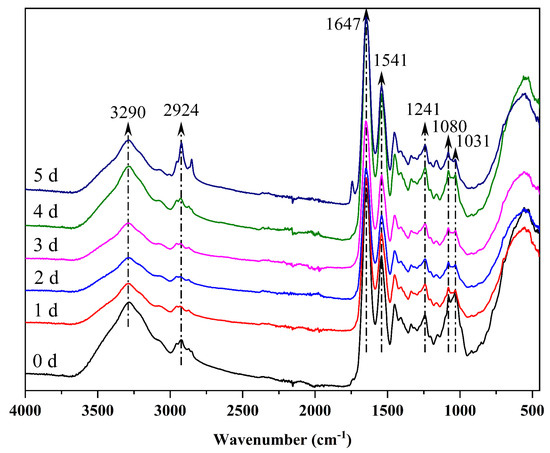 Figure 5 presents the FTIR spectra of gelatin/zein/glucose films after the nanofiber films had been subjected to Maillard reactions for 0~5 days. The band centered at 3290 cm−1 was assigned to the O–H and N–H stretching vibrations that may be associated with hydrogen bonding interactions between gelatin and zein [29]. The band at approximately 2924 cm−1 was attributed to the –CH2 stretching vibration of aliphatic groups [30]. The absorption peaks near 1647 cm−1, 1541 cm−1, and 1241 cm−1 were ascribed to the C=O stretching vibrations of the amide I, the C–N stretching vibration of amide II, and C–N stretching and N–H bending combination of amide III, respectively [16]. The peaks at 1080 cm−1 and 1031 cm−1 resulted from the C–O stretching of glucose [31]. The protein is uniformly dispersed in the nanofibers due to the absence of peak split in the spectra [32].