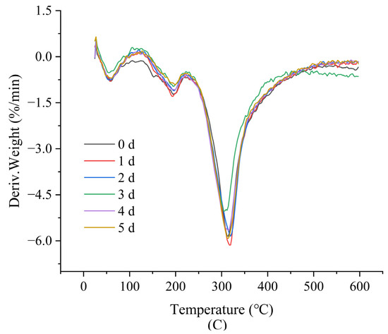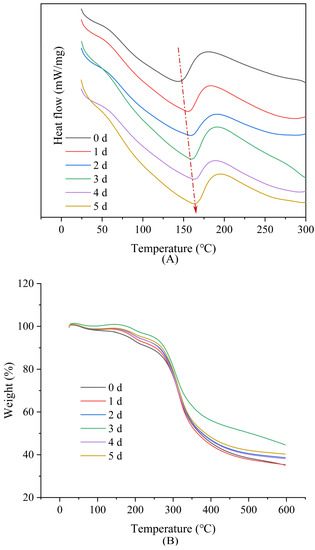The DSC and TGA curves of the films after Maillard reaction for 0~5 days are presented in Figure 6, with results summarized in Table 2. The characteristic heat absorption peaks and the corresponding enthalpy of the DSC curves are referred to as the denaturation temperature (T) and denaturation enthalpy (ΔH), respectively. The denaturation temperature rapidly increased from 143.5 °C to 155.4 °C during 1 day of the Maillard reaction, with a value of 163.9 °C observed by day 5. The increase in denaturation temperature implied an increase in the thermal denaturation stability of the films, suggesting the formation of a more stable conjugate compound between the protein and glucose. Kchaou et al. [34] likewise confirmed that crosslinking between fish gelatin and protein led to a more thermally stable matrix.