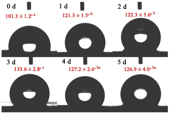 The water contact angles of gelatin/zein/glucose nanofibers after Maillard reactions conducted at 60 °C and 50% RH for 0~5 days. Values with different superscript letters are significantly different (p < 0.05).