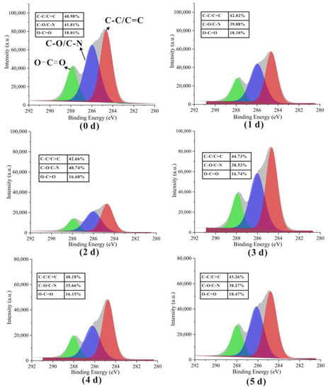 The three characteristic peaks observed at 284.7, 286.2, and 288.0 eV in the high-resolution C1s spectra in Figure 9 correspond to C–C/C=C, C–O/C–N, and O–C=O, respectively [39]. The C–C/C=C proportion was observed to increase from 40.98% to 43.26%, while C–O/C–N and O–C=O decreased from 41.01% to 35.66% and 18.01% decreased to 16.15%, respectively, over the first four days; these trends appeared to pick up by the fifth day, consistent with the occurrence of Maillard reactions.