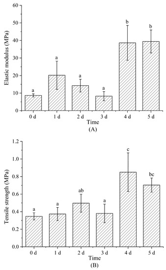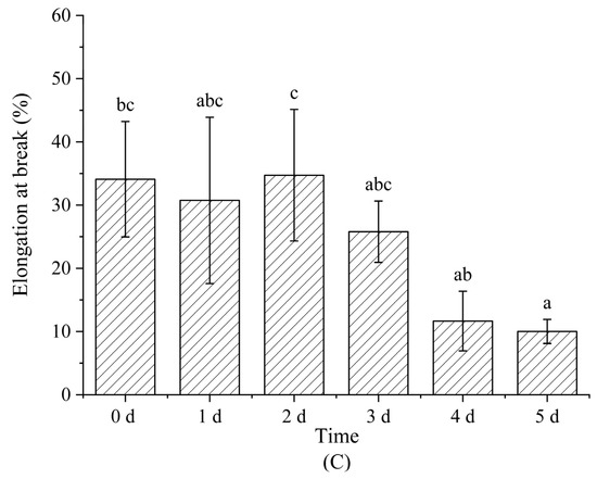 The elastic modulus (A), tensile strength (B), and elongation at break (C) of gelatin/zein/glucose nanofibers after Maillard reactions conducted at 60 °C and 50% RH for 0~5 days. Values with different superscript letters are significantly different (p < 0.05).