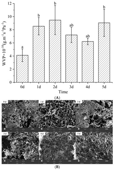 The water vapor permeability (WVP) of nanofibers after Maillard reaction for 0~5 days is shown in Figure 11A. WVP was observed to increase significantly during days 0–2, and on day 5, while no significant changes were observed on reaction days 3 and 4. WVP generally involves water vapor absorption and diffusion processes, which are related to the ratio of hydrophilic to hydrophobic components and the arrangement of (polar and non-polar) groups [24,43]. Gelatin and glucose hydrophilia contributed to nanofiber water swelling on day 0, which led to low porosity and the formation of an absorbent mat that exhibited low WVP. However, glycation was complete and the nanofibers were tightly crosslinked after 3~4 days of reaction, which led to lower porosity and a higher number of outward-facing non-polar groups that enhance hydrophobicity and lower the WVP. The production of free amino groups affected WVP by the fifth day, as the reaction entered the intermediate step of the Maillard reaction. This conclusion was consistent with the WCA results.