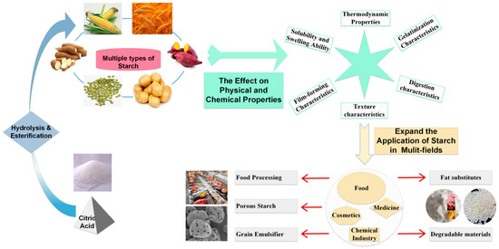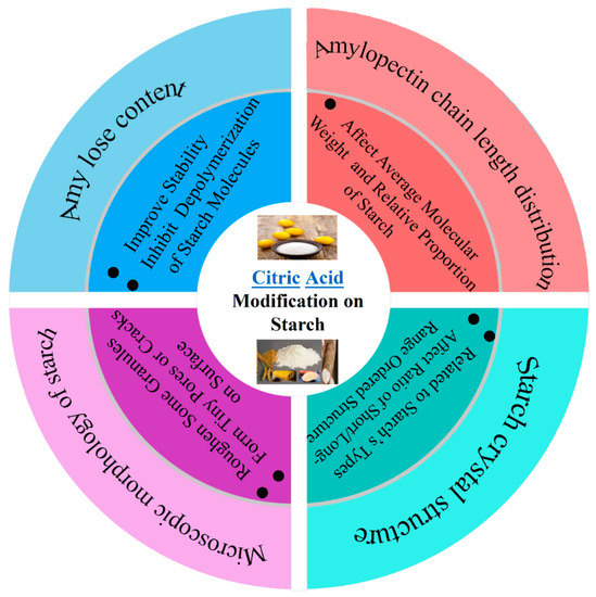 In this paper, the effects of CA modification on the amylose content, amylopectin chain length distribution, microscopic morphology, solubility and swelling ability, thermodynamic properties, gelatinization properties, digestibility properties, texture properties and film-forming properties in starch were described (As shown in Figure 3 and Figure 4). The application status and development trend of CA modified starch were reviewed.