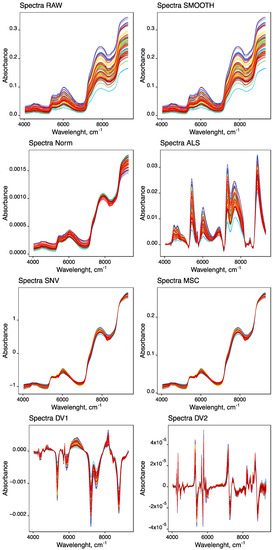 Several data spectrum treatments (processing) were considered [40]: SMT; DV1, and DV2 derivatives; normalization (NORM) to unit area and correction of spectral baseline as SNV; MSC; and asymmetric least squares (ALS). All these treatments, together with the smoothing processing; and, also, the combinations of the normalization and correction of spectral baseline with DV1.