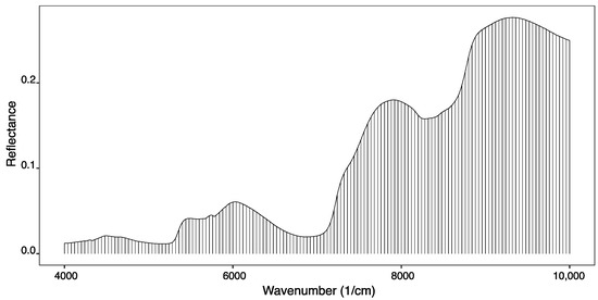 Each sample was analyzed by NIR three times in the range of 4000 to 10,000 cm−1. The three spectra replicates were used in the multivariate analysis since it allowed us to include the variability associated with the heterogeneity of the samples and contribute to the adjustment of more robust models. Overall, the spectra presented absorbance signals that varied between 0.005 and 0.345.