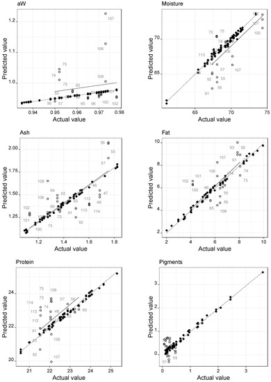 The predictive performance for all the best SVMR-Poly models obtained (referred to in Table 3) can be visualized in Figure 4. Globally, the results of the present study revealed that it is not possible to obtain a simultaneous prediction of the 10 parameters analyzed with NIRs with high accuracy. The plots showed that better prediction results can be obtained since, in general, the test data samples are nearby the line adjusted for the training data. Some samples had great variability in the spectra obtained in the test dataset. However, it was considered that this variability must be reflected in the data, as it shows that the calibration models identified samples with high variability in the spectra that, therefore, should be reanalyzed in the NIR. This situation is evident in the calibrations of aW, moisture, ash, fat, protein, RT, and CT parameters. The collagen plot shows that the prediction generally results in default levels in the test group data. The parameter pigments and WHC showed that in the test subset, their levels have little variability, which can contribute to poor prediction results.