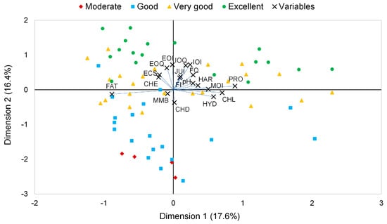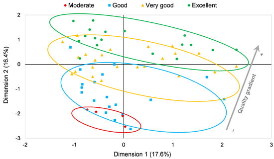 The initial screening of the results shown in Figure 1 allowed the elucidation of a quality gradient in the distribution of the samples in the bi-dimensional space (Figure 2). Specifically, samples with the lowest quality, named Moderate (red), were located on the lower part of the graph, in contrast to the highest quality samples classed as Excellent (green), which were found on the upper part of the scatter plot.