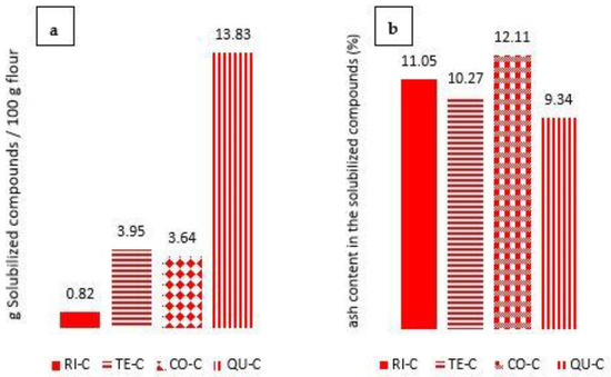 The supernatants from centrifuged samples were placed in previously ignited, cooled and tared porcelain crucibles. The crucibles were kept at 105 °C for 24 h in an oven to determine the amount of soluble dry matter, followed by incineration in a muffle furnace at 500 °C for 24 h to determine ash content in the soluble components. Results were expressed as g soluble compounds/100 g flour, and ash content in the solubilized compounds (%). Measurements were performed in duplicate.