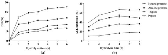 The degree of hydrolysis (a) and ACE inhibitory activity (b) of hydrolysates with alkaline protease, papain, neutral protease, and trypsin. The results are presented as the means ± SD (n = 3).