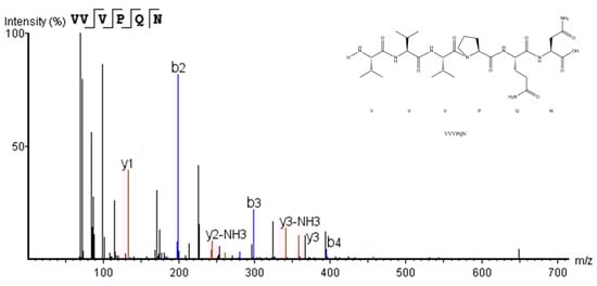 ACE inhibitory peptides are usually short-chain peptides containing 2–12 amino acids [25]. A total of 859 peptides were identified in this study. The identified peptides were comprised of 5–18 amino acids, with 6–9 amino acids constituting the majority (Figure 4a). Peptides with the following characteristics: A de-novo score higher than 95, a peak area higher than 108, and a binding energy below −7.5 kcal/mol were selected, including seven peptides (VVVPQN, LFDRKPD, FDRKPD, LASRTGPFE, LNAREPQ, LHEGDWGHVGS, and LTDEHGHPVQ). Some physicochemical properties, such as pI and GRAVY, of the seven peptides were shown in Table 1. They were then chemically synthesized with a purity above 95% and their ACE inhibitory activity was verified, respectively. As shown in Figure 4b, VVVPQN, the highest content peptide in F2 component (6.47%), showed the best ACE inhibitory activity as well, reaching 80.46% at a concentration of 0.5 mg/mL. Hence, VVVPQN was considered to contribute more than other components in F2 to the ACE inhibitory. Moreover, it was a novel ACE inhibitory peptide that had not been reported previously. Its MS/MS spectrum is shown in Figure 5. Based on the regression equation (y = 23.595 ln(x) + 98.175) as shown in Figure 4c, the IC50 value of the ACE inhibitory activity of VVVPQN was 0.13 mg/mL (198.66 μmol/L), which was lower than GYGYNY’s from camellia glutelin-2 hydrolysates (IC50: 384 μmol/L) [10]. The ratio of hydrophobic to hydrophilic amino acids could affect peptides’ ACE inhibitory activity according to previous studies [25]. The content of hydrophobic amino acids in VVVPQN was 66.67%, which was significantly higher than that of the other six peptides identified in this study. In addition, some peptides that have been identified in previous studies, such as peptides VVNE, VVTR, and VVGVD derived from wild almond proteins [26], peptide VTPVGVPKW isolated from black cumin seed [27], and peptide VPAAPPK derived from haruan (Channa striatus) myofibrillar protein hydrolysate, have indicated that peptides with Val at the N-terminal have high ACE inhibitory activity [28]. This may explain the potent ACE inhibitory activity of VVVPQN.