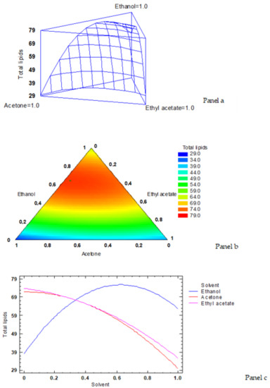 The trace plot for the lipid content is shown in Figure 1c. This plot shows the effect on the lipid yield of a ratio increase or decrease in any of the solvents employed. Taking into account the centroid point (i.e., 0.333 value for each solvent), the lipid content showed to increase as the ethanol ratio increased in the extracting system, while it decreased with increasing acetone and ethyl acetate ratios.