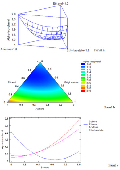 The trace plot for the α-tocopherol content is shown in Figure 2c. This plot shows the effect on α-tocopherol values of a ratio increase in any of the low-toxicity solvents tested. Considering the centroid point (i.e., 0.333 value for each solvent), the α-tocopherol value increased as the acetone and ethyl acetate ratios increased in the extracting system, while it decreased by increasing the ethanol ratio.