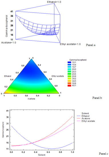 The trace plot for the γ-tocopherol content is shown in Figure 3c. This plot shows the effect on γ-tocopherol values of a ratio increase or decrease in any of the low-toxicity solvents employed. Considering the centroid point (i.e., 0.333 value for each solvent), the γ-tocopherol value increased as the acetone and ethyl acetate ratios increased in the extracting system, while it decreased by increasing the ethanol ratio.