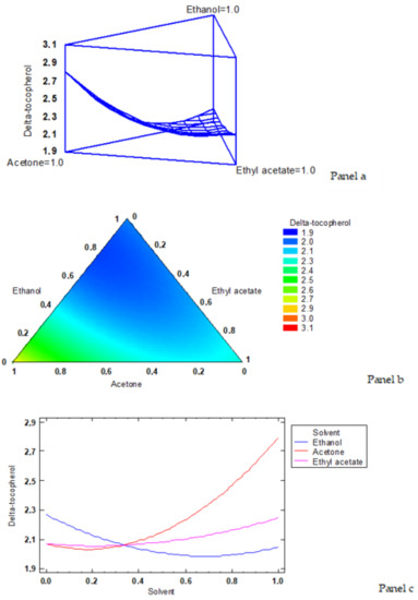 The trace plot for the δ-tocopherol content is shown in Figure 4c. This plot shows the effect on δ-tocopherol values of a ratio increase or decrease in any of the ratios employed in the different low-toxicity solvents. Taking into account the centroid point (i.e., 0.333 value for each solvent), the δ-tocopherol value increased as the acetone ratio increased in the extracting system, while it decreased with increasing ethanol and ethyl acetate ratios.