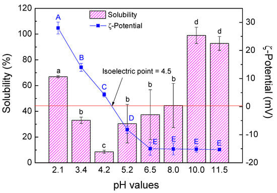 Solubility and ζ-potential values as a function of pH values. Different letters show significant differences in the values for solubility (a–d) and the values for ζ-Potential (A–E) (p < 0.05).