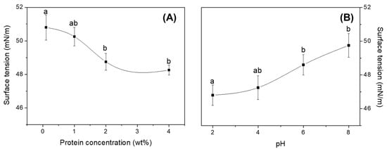 Surface tension values as a function of protein concentration at pH 2 (A) and as a function of pH at a protein isolate concentration of 2 wt% (B). Different letters show significant differences (p < 0.05).