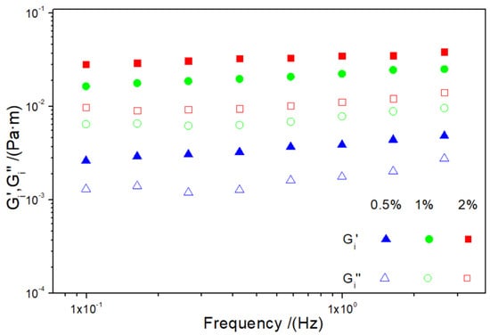Figure 3 shows the values of the interfacial elastic and viscous moduli (G′ and Gi″, respectively) as a function of frequency for the different systems tested (0.5 wt%, 1 wt% and 2 wt% isolate protein concentration) at a constant pH value of 2.
