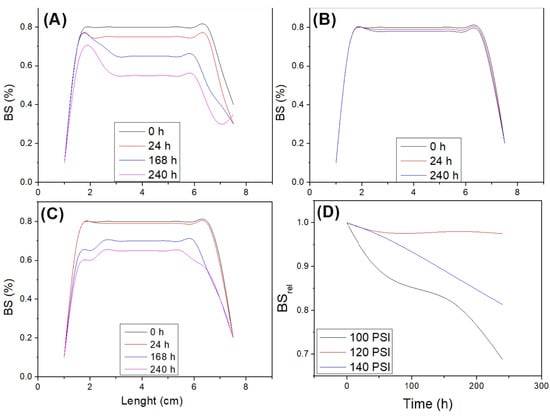 The results of the backscattering at different pressures (100 PSI, 120 PSI and 140 PSI) for the system made with 2.0 wt% of soy protein isolate and pH 2 (selected conditions in the previous characterization) are shown in Figure 4A, Figure 4B and Figure 4C, respectively. Figure 4D shows the evolution of the relative BS as a function of time obtained within the middle part of the tube defined as follows: