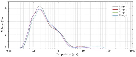 As can be observed, there are no significant differences in the DSD over time, showing an almost normal unimodal distribution. However, over time, the emulsion becomes more unstable, increasing the dispersity and the droplet size, as can also be observed in Table 4. The uniformity of the distribution can be seen using parameter U (Table 4), since, the lower the U, the higher the uniformity of the system. Comparing the values over time, up to 7 days, there are no significant differences, whereas, at 19 days, the U value increased significantly. Nevertheless, Sauter’s diameter (D3,2) remains constant in the whole period of evaluation without significant differences between days. However, the volumetric diameter (D4,3) increases significantly, which indicates that growth in droplet size is occurring at high values, thus increasing the dispersity as a consequence of coalescence.