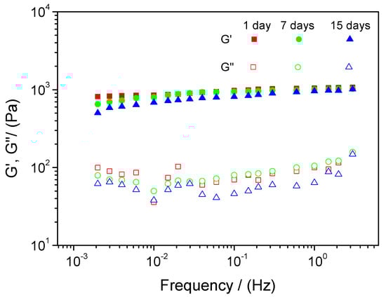 Figure 6 shows the frequency sweep for the system with 2.0 wt% and pH 2 over time (1 day, 7 days and 15 days).