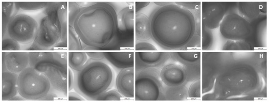 Microscopic images of microcapsules obtained from chokeberry juice and preparation with different coating materials: (A) chokeberry juice, coating: alginate; (B) chokeberry juice, coating: alginate + pectin; (C) chokeberry juice, coating: alginate + carrageenan; (D) chokeberry juice, coating: alginate + chitosan; (E) chokeberry preparation, coating: alginate; (F) chokeberry preparation, coating: alginate + pectin; (G) chokeberry preparation, coating: alginate + carrageenan; (H) chokeberry preparation, coating: alginate + chitosan.