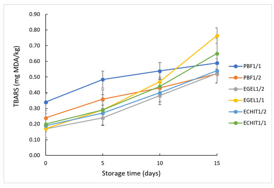 Figure 1. TBARS values (mg MDA/kg) of control and reformulated pork patties at 0, 5, 10 and 15 days of storage at 4 °C; PBF1/1—normal fat patties; PBF1/2—patties made by half replacement of pork backfat with water; EGEL1/2—patties made by half replacement of pork backfat with EGEL; ECHIT1/2—patties made by half replacement of pork backfat with ECHIT; EGEL1/1—patties made by full replacement of pork backfat with EGEL; ECHIT1/1—patties made by full replacement of pork backfat with ECHIT.
