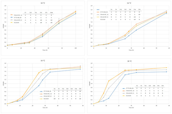 Growth kinetics at different temperatures of the three strains in YPD broth at pH 3.2. Different letters at each sampling point indicate significant differences (ANOVA: Tukey t-test. p < 0.05—XLStat).