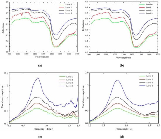 The average values of the sample power spectrum and absorbance spectrum can be obtained by THz time-domain spectroscopy. Figure 5e shows the average value curve of the power spectrum of the four tomato leaf mildew grades at 0.1–2.0 THz, with clear absorption peaks observed at approximately 0.43 THz and 1.27 THz, as well as a faint absorption peak at approximately 0.53 THz. Figure 5c shows the mean absorbance curves for the four tomato leaf mildew classes at 0.1–2.0 THz, with a clear absorption peak observed at approximately 0.79 THz. For level 3 mold leaves, a relatively clear absorption peak was observed at approximately 1.89 THz. However, the other three grades of leaf mildew in leaves did not have this absorption peak, indicating that this absorption may be an error caused by the equipment itself, and hence should not be directly judged as the peak of the absorbance sample. The identification of each sample should be achieved by mathematical modeling.