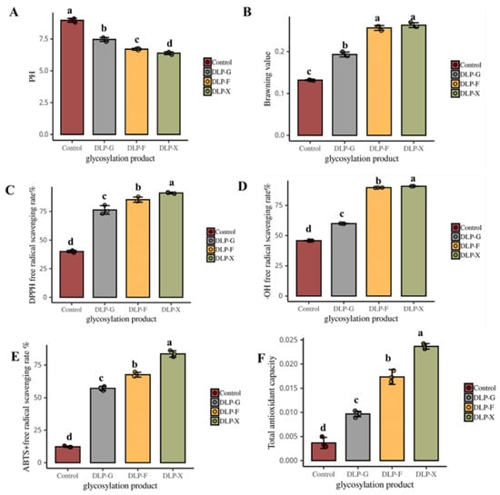 The effects of glycosylated product with glucose, fructose, and xylose on pH are shown in Figure 1A. The pH of the system is significantly lower than that of control after the Maillard reaction (p < 0.05). The pH of DLP-F is significantly lower than DLP-G and higher than DLP-X (p < 0.05). The results show that the fructose and xylose can significantly reduce the pH of glycosylation reaction compared to control (p < 0.05). The pH of the system drops from 9 to 5.5 after the Maillard reaction. The pH of xylose reaction system is the lowest, which may be owing to reacting more readily than hexose []. Liu et al. [] found that the consumption of amino groups and the formation of organic acids may be the reason for the decrease in pH in the Maillard reaction system. Therefore, it could be concluded that the types of sugar could significantly affect the pH of the reaction. The pH of DLP-X is significantly lower than that of DLP-G and DLP-F (p < 0.05).