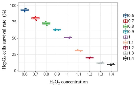 A total of 100 mL of HepG2 cell suspension was inoculated at a density of 2 × 105 cells/mL per well into a 96 well culture plate and incubated at 310.15 K for 12 h. Then 100 mL H2O2-containing incomplete medium (without serum) was added after the cells adhered and stabilized. At this time, the mass concentration of H2O2 in each well was 0 × 10−3, 0.6 × 10−3, 0.7 × 10−3, 0.8 × 10−3, 0.9 × 10−3 1.0 × 10−3, 1.1 × 10−3, 1.2 × 10−3, 1.3 × 10−3, and 1.4 × 10−3 mol/L. The cell viability was determined by the method of CCK-8 after culture for 4 h, which was based on Hsu et al. [] with minor modifications. Each experimental group was set up with 5 replicates.