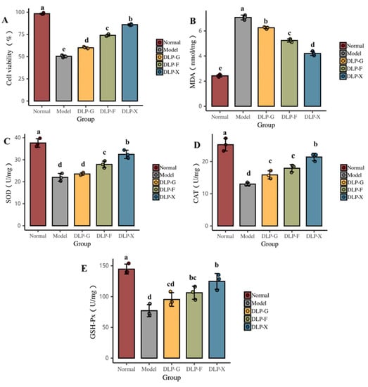 Oxidative damage of these cells is reversible. The cell activity, SOD activity, CAT activity, and GSH-Px activity are significantly increased (p < 0.05) and the content of MDA significantly decrease (p < 0.05) after treatment with glycosylated products of duck liver for 24 h compared with the normal group. DLP-X can significantly reduce the MDA production (p < 0.05), indicating that it has a good effect on inhibiting the lipid peroxidation. The results show that glycosylated products of duck liver can up-regulate the activity of SOD, CAT, and GSH-Px antioxidant enzymes and maintain the balance of the redox-active in cells. Thereby, it can reduce the oxidative damage that is caused by H2O2 and improve the cell survival rate. Some studies found that different glycosylated products had certain differences in the expression of key proteins, some of which could regulate cell apoptosis and, ultimately, lead to oxidative damage in cells [].