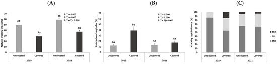 (A) Natural cracking index (%), (B) induced cracking index (%), and (C) incidence of the different types of cracking in sweet cherry fruits (cv. Early Bigi) uncovered and covered during 2 harvesting years (2019 and 2021). Data are expressed as mean ± standard deviation. Different capital letters correspond to significant differences (p < 0.05) between years within each treatment; different small letters correspond to significant differences (p < 0.05) between treatment for the same year. Types of cracking: SCR: stem cavity region, CR: cheek region, and SSR: stylar scar region.