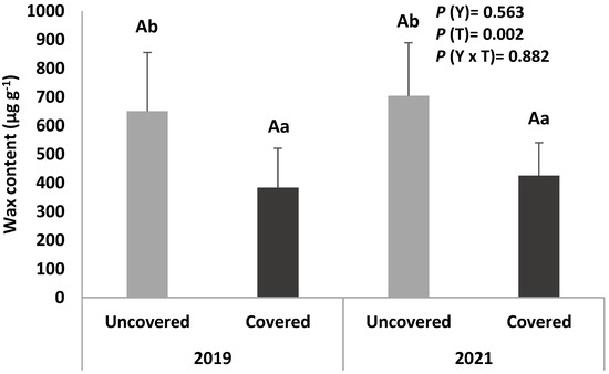 Epicuticular and intra-cuticular wax content of sweet cherry fruits (cv. Early Bigi) uncovered and covered, during 2 harvesting years (2019 and 2021). Data are expressed as mean ± standard deviation. Different capital letters correspond to significant differences (p < 0.05) between years within each treatment; different small letters correspond to significant differences (p < 0.05) between treatment for the same year.