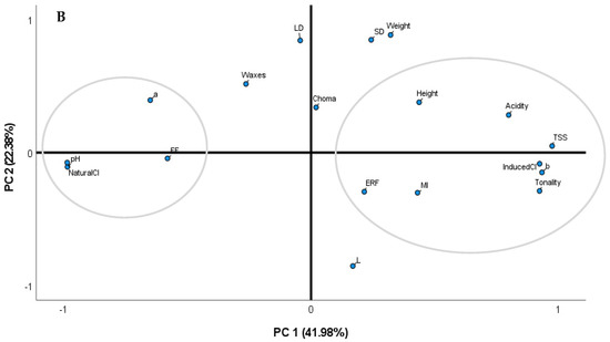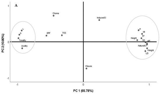 Considering the PCA performed with covered trees, the biometric parameters, chemical parameters (TSS, acidity, and MI), the tonality, the ERF, and the induced cracking index are in one group, while the pH, the FF, the chromatic parameter a*, and the natural cracking index are in another group, showing the contrary tendencies of the natural and the induced cracking index in these trees.