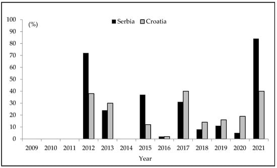 As can be seen from Figure 1, AFs were not detected in Serbia neither AFB1 in Croatia in four (2009–2011, 2014) out of thirteen years under this review. In Serbia in three years (2016, 2018, and 2020), and in Croatia in two years (2016 and 2018), presence of investigated aflatoxins was registered in less than or around 10% of maize samples. Contrary to this, considerably higher levels of aflatoxin contamination of 72%, 24%, 37%, 31%, and 84% were detected in maize samples from Serbia harvested in 2012, 2013, 2015, 2017, and 2021, respectively. Based on the obtained results, it can be assumed that Serbia becomes susceptible to AFs presence-evoked problems, since AFs were detected in Serbian maize in nine out of thirteen years embraced by this review, in five out of these nine years even in high prevalence rates ranging from 24% to 84%. These substantial deviations from AFs occurrence patterns, seen in maize samples collected in different years, can be explained by the fact that in the thirteen year review period Serbia had experienced climate changes. As for Croatia, it can be concluded that the percentage of positive samples uncovered in the referent period was lower than in Serbia, but the occurrence of AFB1 in the last thirteen years was still significant, with the maximum of 40% of positives in 2021 and 38% of positives in 2012. While the occurrence of AFB1 evidenced in 2012 was slightly lower compared to 2021 and even more so to other years under this review, it is important to emphasise that in 2012 this mycotoxin was present in maize in extreme content [], never recorded in Croatia either before or later.