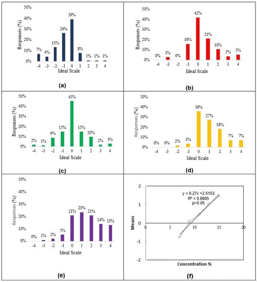 Histogram of the responses for the Ideal Sweetness test, with different sucrose concentrations: 7.0% (a) blue bars, 9.0% (b) red bars, 11.0% (c) green bars, 13% (d) yellow bars, and 15% (e) purple bars, and straight-line graph and equation obtained from linearizing the Ideal Sweetness test results (f).