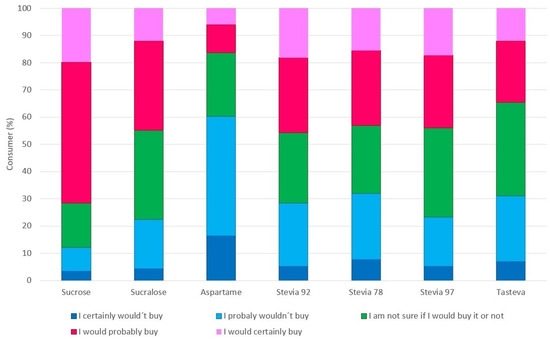 According to the purchase intent histogram of the samples (Figure 3), the product that had the highest positive purchase intent (would certainly buy and would probably buy) was the sucrose sample (67.08%), followed by the aspartame and sucralose also had high positive purchase intent percentages of 58.48% and 48.16%, respectively. This result can be explained by the presence of lower intensity of bitter taste and total bitter taste duration in these samples. As the stevia tasteva had a shorter bitter taste duration, but it obtained a positive purchase intent with the same tendency compared to the other samples sweetened with stevia (tasteva = 30.96%; stevia RebA 78 = 31.82%; stevia Reb A 92 = 29.24%; stevia Reb 97 = 22.36%).