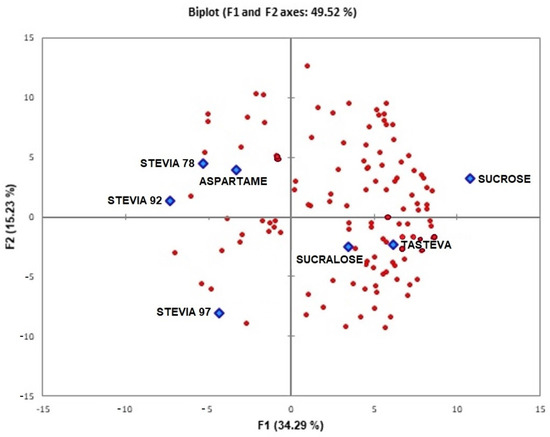 The internal preference map was obtained by principal components 1 and 2, which together explained 49.52% of the variation between samples. This value is relatively low; however, it is considered adequate for consumer acceptance results, as the liking values can vary in a large range, which also needs to be measured in this study [12]. Other published studies have shown concordant results in other products [3,19]. The dispersion of consumers’ acceptance of individual notes to overall liking (red dot points) is evidenced in Figure 4 because the consumers’ preference spread near all samples (blue diamonds). This preference is evidenced by the proximity of the red dot by a determined sample. As it is possible to observe that the taster closer to the nectar with sucrose is the nectar sweetened with sucralose, which indicates a greater preference for these samples. These samples obtained higher acceptance averages by performing Tukey. On the other hand, there is little concentration of tasters around the stevia with 78%, 92%, and 97% rebaudioside A and tasteva samples, which indicates a lower preference of consumers for these samples, and which can be proven through the overall impression analysis of the Tukey test. It is important to observe the purchase intention results that are in concordance with the preference data. These results evidence the importance of the application of sensory analysis to each specific product because the results can vary drastically in function to the food matrix. To blackberry nectar, the results were interesting because it presents values different from other products.