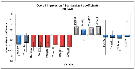 Preference drivers of blackberry nectar. Legend: ImaxSw = Maximum intensity of sweet taste; TImaxSw = Maximum intensity time to sweet taste; TtotalSw = Total time of sweet taste; AreaSw = Area under the curve of sweet taste stimulus; ImaxBit = Maximum intensity of bitter taste; TImaxBit = Maximum time to intensity of bitter taste; TtotalBit = Total time to bitter taste; AreaBit = Area under the curve of bitter taste stimulus; ImaxBF = Maximum intensity of blackberry flavor; TImaxBF = Maximum time to intensity of blackberry flavor; TtotalBF = Total time blackberry flavor; AreaBF = Area under curve of blackberry flavor stimulus; ImaxAc = Maximum intensity of acidic taste; TImaxAc = maximum intensity time to of acidic taste; TtotalAc = Total time acidic taste; AreaAc = Area under the curve of acidic taste stimulus. The PLSR analysis graphically shows the positive or negative importance of the parameter’s time-intensity curves, evidencing the consumers’ preference drivers. The columns on the positive part of the y-axis (gray) represent parameters with positive importance, whereas the columns on the negative part of the y-axis (red) represent parameters whose presence is negative to acceptance of the blackberry nectar. The vertical lines represented in the boxes (columns) of the parameters of time-intensity curves (coefficients) are the confidence intervals. If the confidence interval exceeds (crosses) the x-axis to the opposite side, it means that the corresponding parameter is not significant (p > 0.05) in the consumer’s preference (blue columns). However, if the confidence interval does not cross the x-axis to the opposite side, this coefficient (parameter of the curve) is significant for consumer preference (p < 0.05), and it contributes positively or negatively to consumer preference if the bar is facing the positive or negative side of the y-axis, respectively.4. CATA (Check-All-That-Apply).