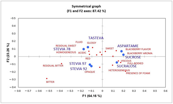 Correspondence analysis of “check-all-that-apply” (CATA) words. Red dots are words used in the CATA and blue dots are the sweeteners applied in the blackberry nectar.