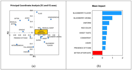 C.d.M.a shows the principal coordinate analysis results, and Figure 7b the mean impact of descriptors from CATA to blackberry nectar. It is possible to verify that the descriptors localized near the overall impression are important and can contribute positively to acceptance. Based on this information, the color red, sweet, blackberry flavor, blackberry flavor, residual sweet, and glossy are important to the consumer in this product. Figure 7b represents the impact of the descriptor on consumer acceptance. The size of the bar, starting from the vertical line (zero), is proportional to the importance of the respective attribute. The greater the length of the bar, the greater the importance of the attribute in the average of consumers’ acceptance in relation to the overall impression.