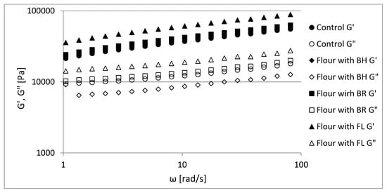 Mechanical spectra of dough samples for flour (control), flour with buckwheat (BH), beetroot (BR) and flax (FL).