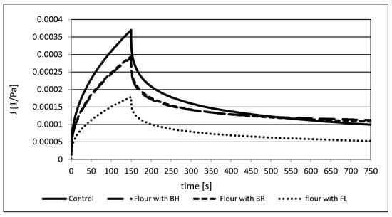 The creep and recovery test is also useful to observe the viscoelastic properties of the dough. The typical creep curves are under constant stress for rye–wheat dough, and its mixtures with fiber-rich additives are shown in Figure 2. At zero stress part of stored energy is returned and can observe recovery phase. All curves have the shape characteristic of viscoelastic materials, and it is caused by reorientation of the bonds in this sort of material [68]. The addition of various powders rich in fiber significantly decreased the compliance values (J), and the greatest decrease was in the flax powder (FL) sample. In the case of BH and BR, changes were less evident, and the curves were almost the same.