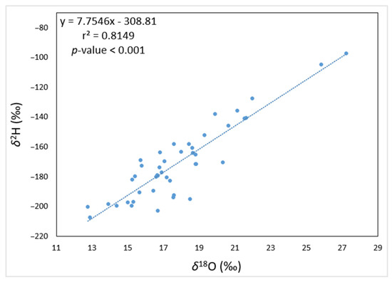 The data also show a good linear correlation between δ2H and δ18O (Figure 1), with the slope (y = 7.8x−308.8; r2 = 0.82, p < 0.001) being comparable to the Global Meteoric Water Line (GMWL).