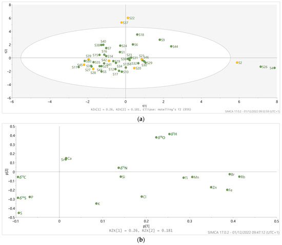 Principal Component Analysis (PCA) was applied to identify trends and examine the distribution of variables in the analyzed samples. For this analysis 46 Spirulina commercial samples from the Slovenian market were obtained, and 18 analyzed parameters (macro-elemental and isotopic composition data) were used (Figure 2). In the PCA score plot (Figure 2a), a grouping of the samples can be observed corresponding to different elemental and isotopic compositions of the included samples. Here, three outstanding groups represented by different variables can be identified. Information about the variables that contributed most to the grouping of the samples in the PCA is provided in the PCA variables loading plot (Figure 2b).