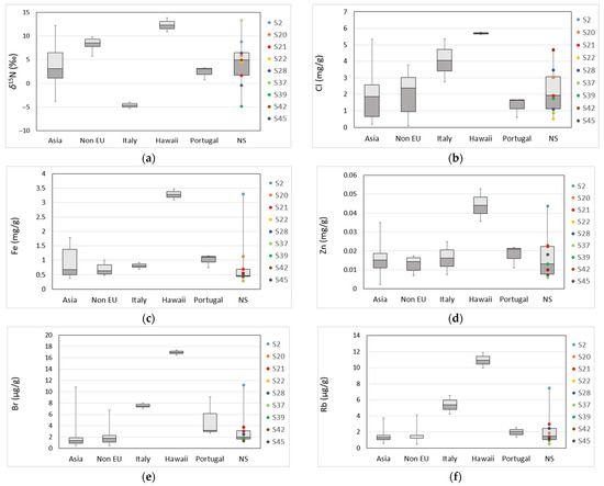 Looking at these results, we can see a close connection between the Hawaiian samples, S4 and S26, and the sample without specified country of origin, S2. Figure 3 presents box plots of δ15N, Cl, Fe, Zn, Br, and Rb composition of Spirulina food supplements according to declared country of origin. The samples of undeclared origin (NS) are marked to compare their isotopic or elemental values with those with declared origins. Sample S2 shows the highest values of Fe, Zn, Br, and Rb among the NS samples. Fe and Zn values fall in the range of the values measured in Hawaiian samples (Figure 3c,d), indicating that it might also originate from Hawaii.