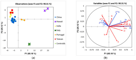 Discriminant analysis (DA) was performed using macro-elemental and isotopic composition data (Figure 4) to investigate the distribution of variables in more detail and reveal possible differences among the samples originating from China (n = 16), Hawaii (n = 2), India (n = 4), Italy (n = 2), Portugal (n = 2), and Taiwan (n = 3). The first two discriminant components (F1 and F2) account for 90.3% of the total variance. In the discriminant function score plot (Figure 4a), each cluster (centroid) is represented by a scatter plot. In the loadings plot (Figure 4b), they appear as vectors demonstrating a degree of association of the corresponding initial variable with the first two discriminant components. Red vectors indicate the most significant variables, and blue vectors represent the least significant variables for sample separation and clustering. Six groups of samples are identified in the DA score plot (Figure 4a).