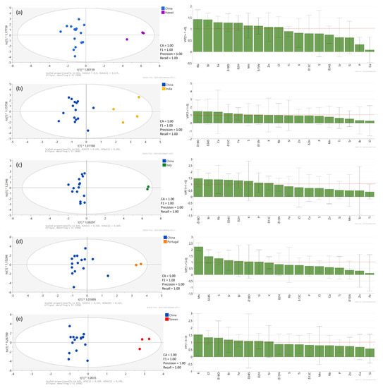 OPLS-DA score plots and VIP values in the pairwise comparisons between different declared countries of origin of Spirulina products derived from all isotopic and elemental composition data. The ellipse on the score plot represents the 95% confidence interval. Red dotted line indicates a criteria for identification of the variables, important for the developed model. Separation of the most numerous class, China, is presented, from Hawaii (a), India (b), Italy (c), Portugal (d), and Taiwan (e).