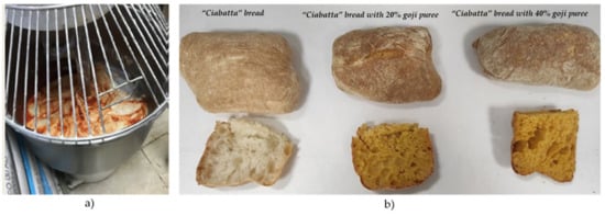 (a) Addition of goji fresh flesh puree to dough (b) from left to right ciabatta bread and enriched ciabatta bread (with 20% and 40% goji puree).